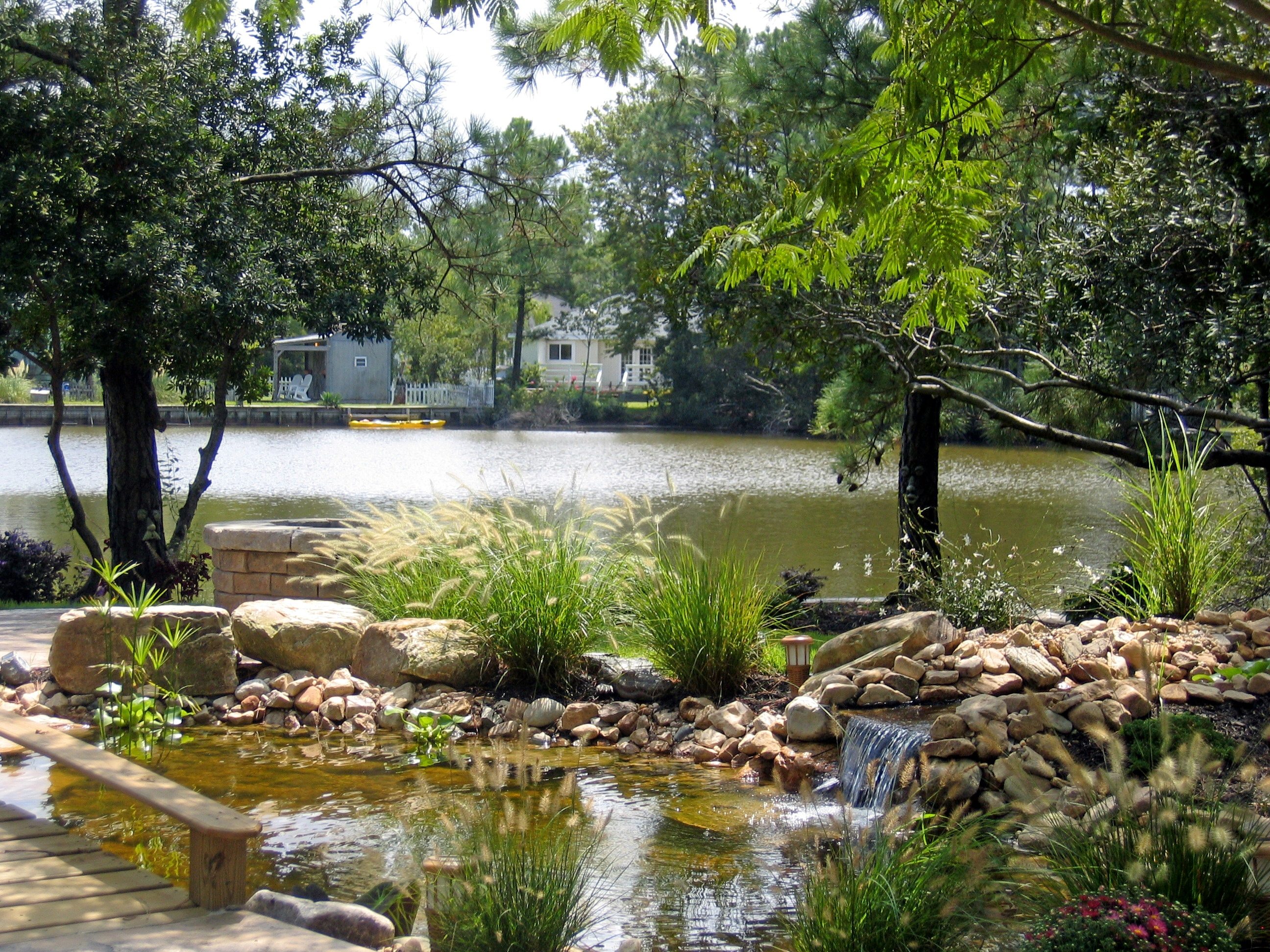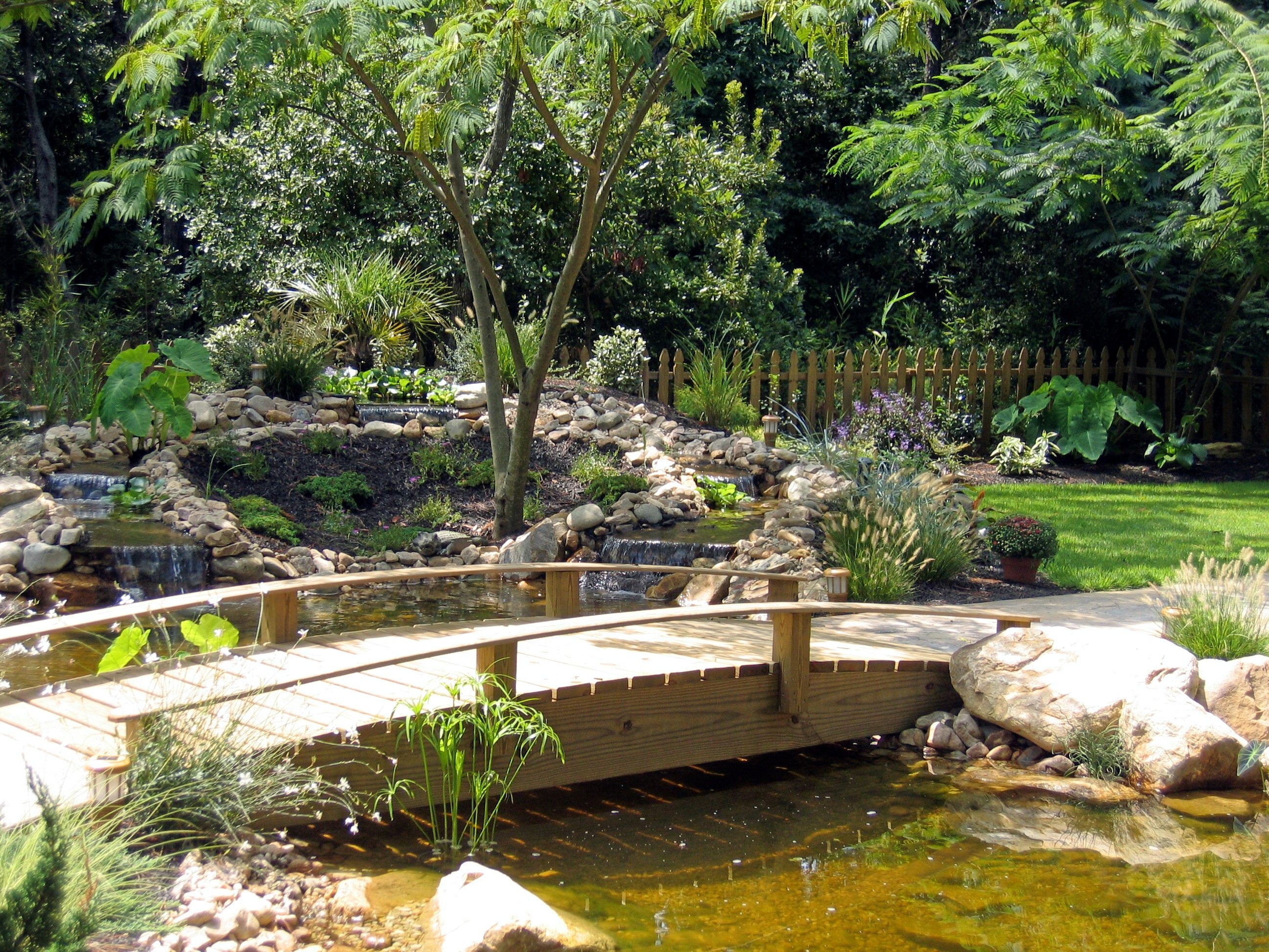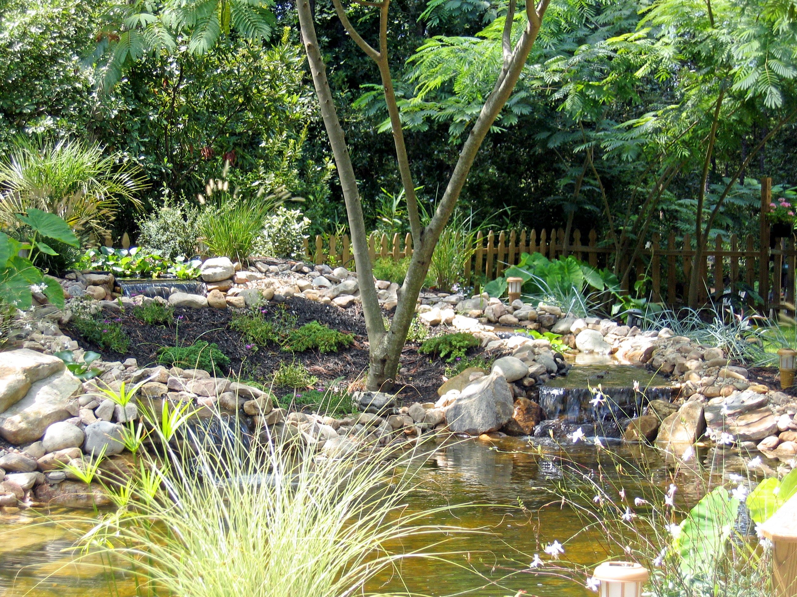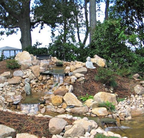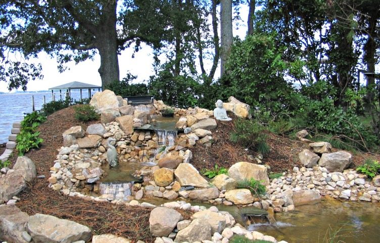 Water features, ponds, decorative concrete, hardscaping, and irrigation.