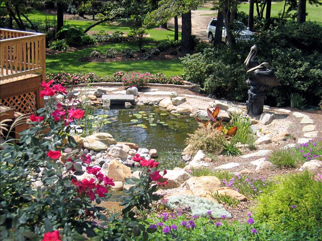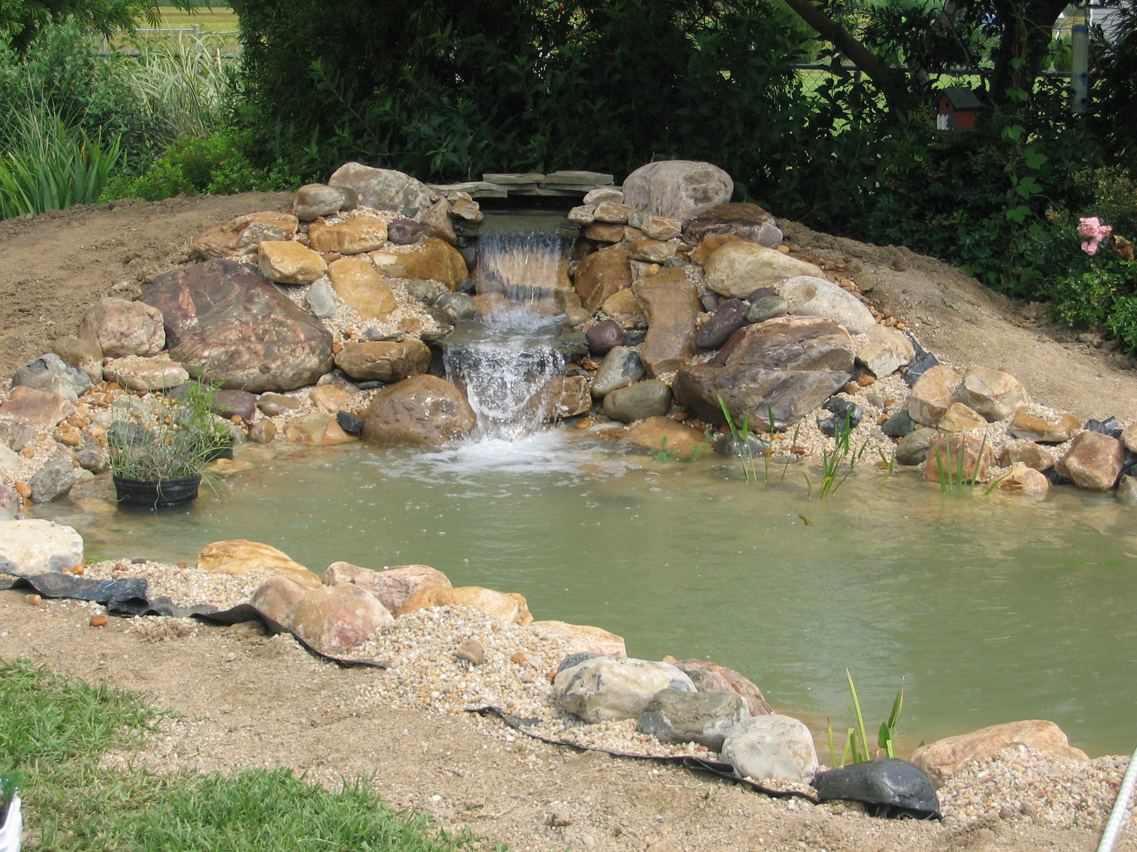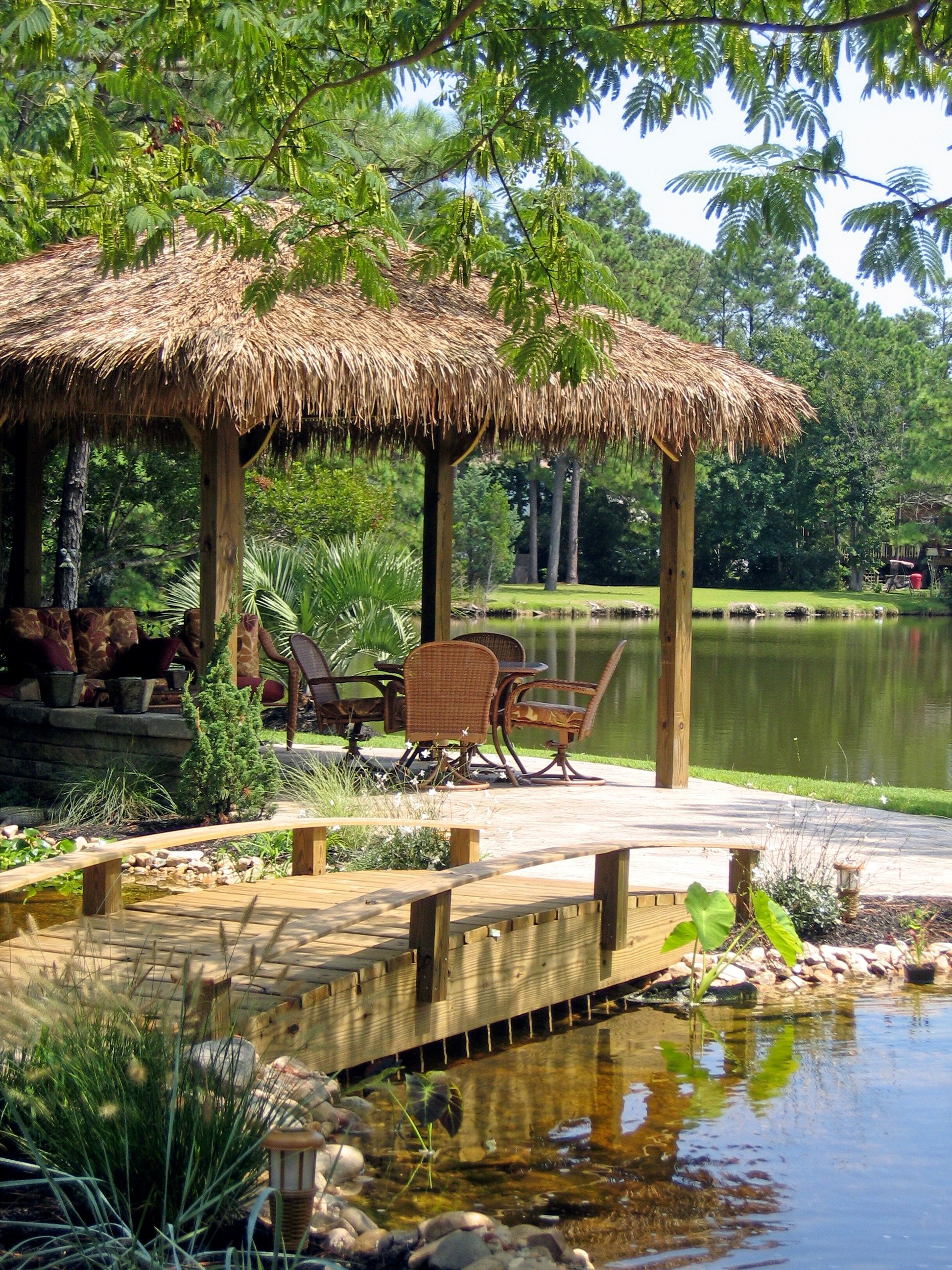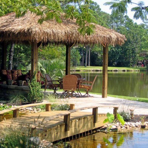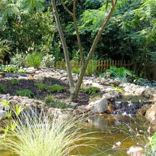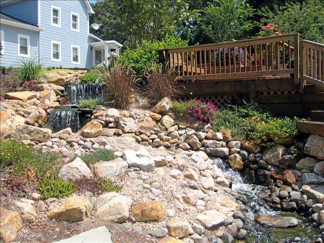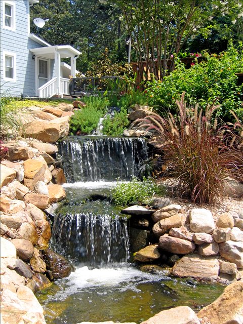 Water features, ponds, decorative concrete, hardscaping, and irrigation.